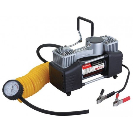 Для того чтобы быстро накачать шины транспортного средства, прекрасно подойдет автомобильный компрессор STARWIND CC-300. Для его работы требуется напряжение питания 12 В, которое имеется в любом автомобиле. Подключение выполняется через клеммы аккумуляторной батареи. Длина шланга составляет 5 м, а длина провода питания - 3 м, благодаря чему прибор можно беспрепятственно дотянуть даже до задних колес грузового автомобиля. На конце шланга есть манометр, который позволяет точно определить давление в колесах. Устройство имеет удобную складную ручку для переноски.