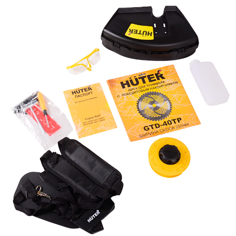 Триммер бензиновый HUTER GGT-2900T оснащен режущими элементами леской и ножом, которые защищены специальным кожухом, предотвращающим разлетание скошенной травы. Такой набор позволяет аккуратно стричь газон и также скашивать высокую поросль и кустарники.