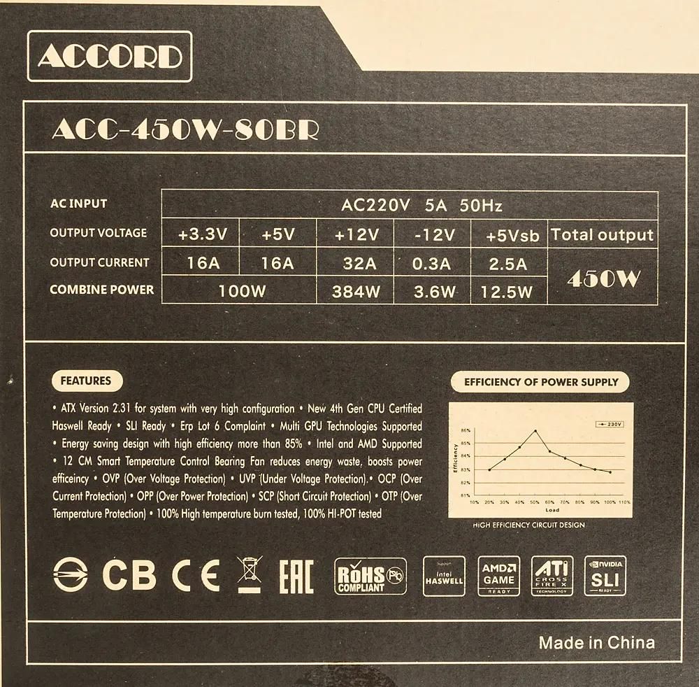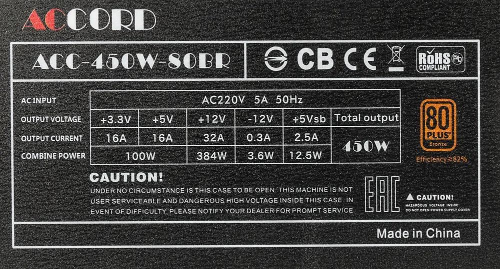 Блок питания Accord ACC-450W-80BR, 450Вт, 120мм, черный, retail