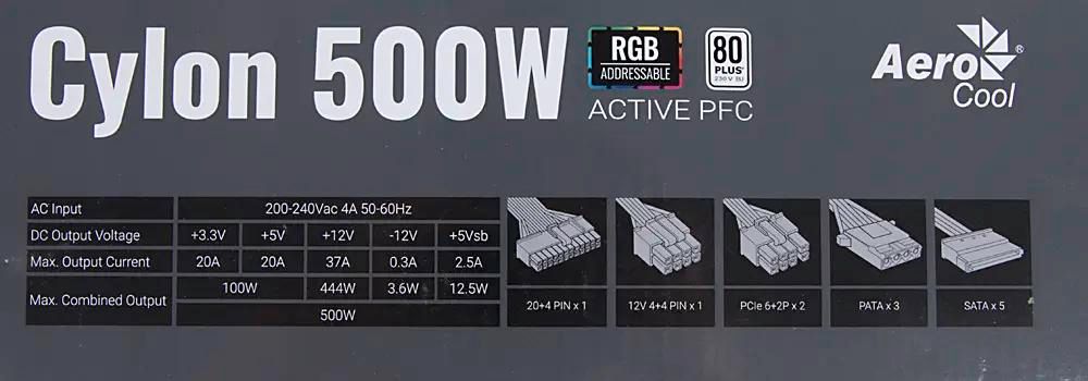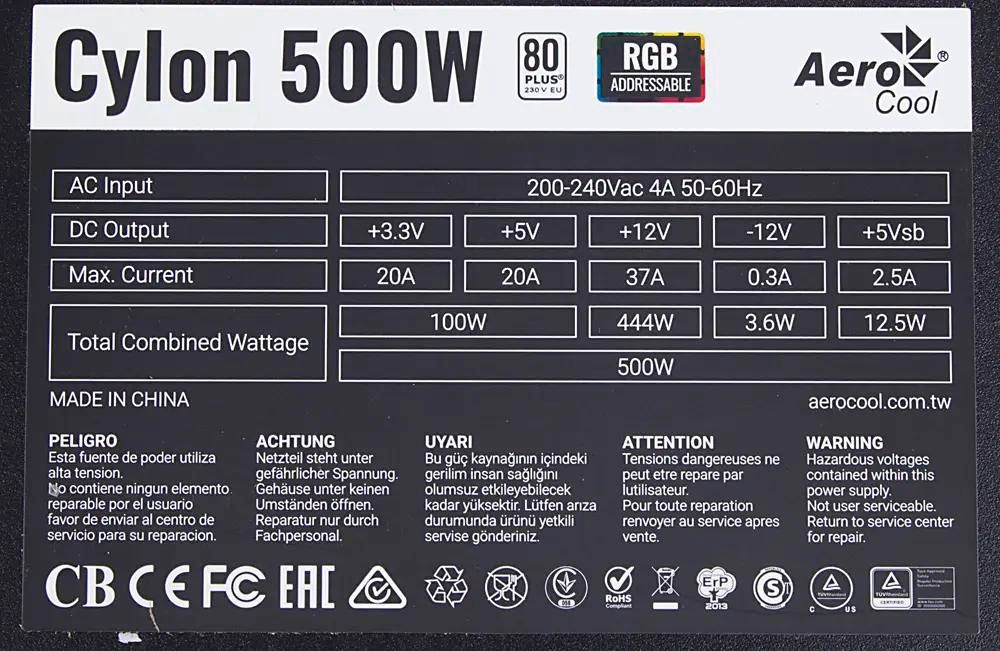 Блок питания Aerocool CYLON 500, 500Вт, 120мм, черный, retail