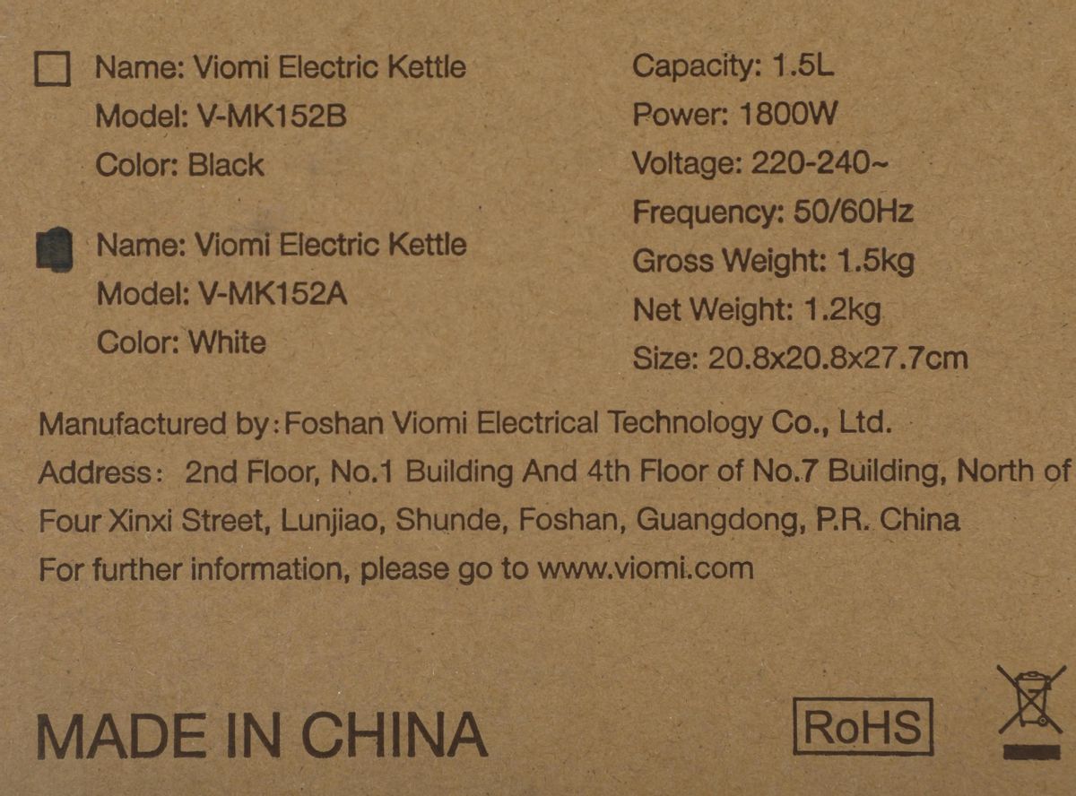 Чайник электрический VIOMI V-MK152A, 1800Вт, белый