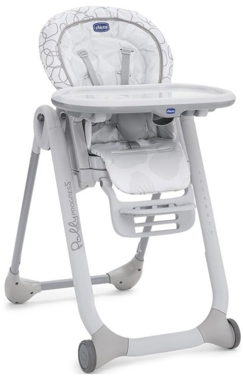 омфортный для ребенка от 6 месяцев до 3-х лет и удобный для его родителей складываемый стульчик с основанием из металла. Если малышу захочется спать после еды, изделие легко трансформируется в люльку — высота сиденья, подножка и наклон спинки имеют 8, 3 и 4 уровня регулировки соответственно. Регулировка предусмотрена и у столешницы — она надежно крепится на подлокотниках изделия, но при необходимости легко и просто снимается. Важное и полезное в бытовом использовании дополнение — поднос с углублениями для столовых приборов. Безопасность ребенка обеспечивает хорошо продуманная конструкция Chicco Polly Progres 5, включающая надежные ремни для фиксации малыша на стульчике. Мягкий матрасик без проблем чистится даже обычной губкой, а чехол можно свободно стирать.