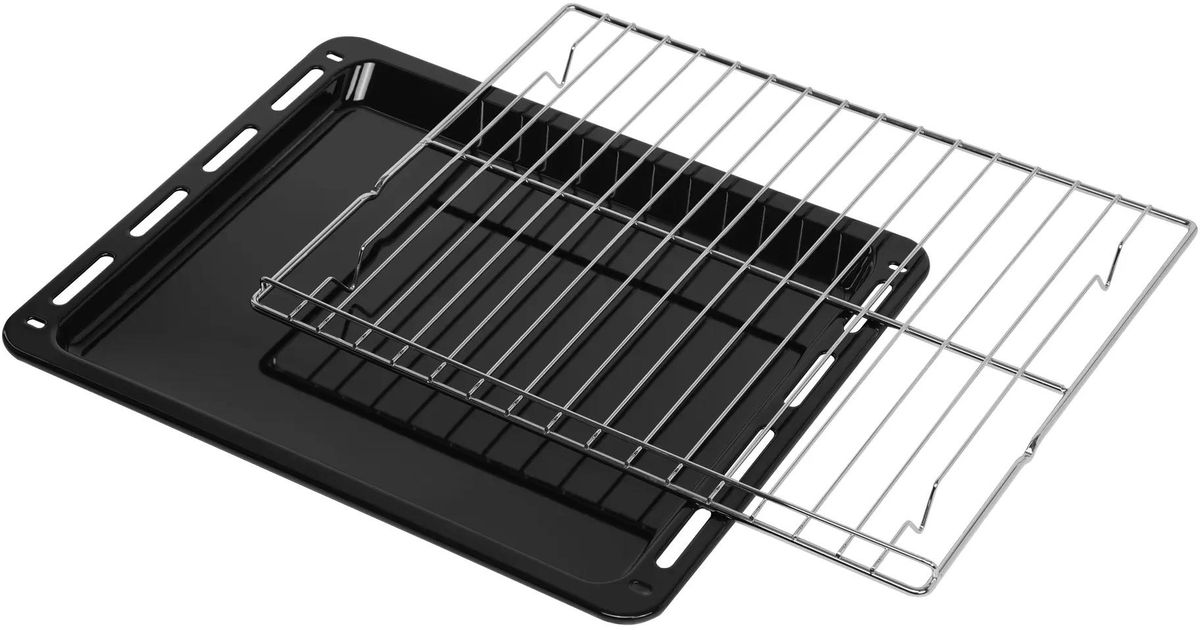 Электронное управление. Оцените комфортный доступ к нужным функциям. У духовки два поворотных регулятора. Ручкой слева выбирайте режим приготовления. Правым переключателем настраивайте температуру нагрева в диапазоне от 30 до 250 °С. Управляйте духовкой с помощью кнопок «СТАРТ» и «СТОП». Предусмотрены кнопки для запуска таймера и установки времени суток. На информативном дисплее отображаются индикаторы температуры и другие показатели.