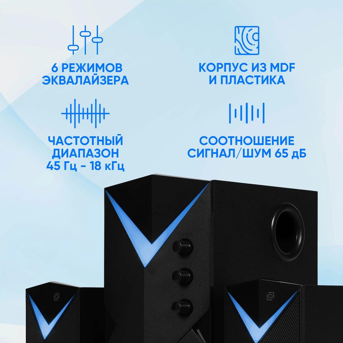 RGB-подсветка. Контурная многоцветная подсветка на фронтальной панели корпуса каждого динамика придает системе яркий и оригинальный внешний вид.