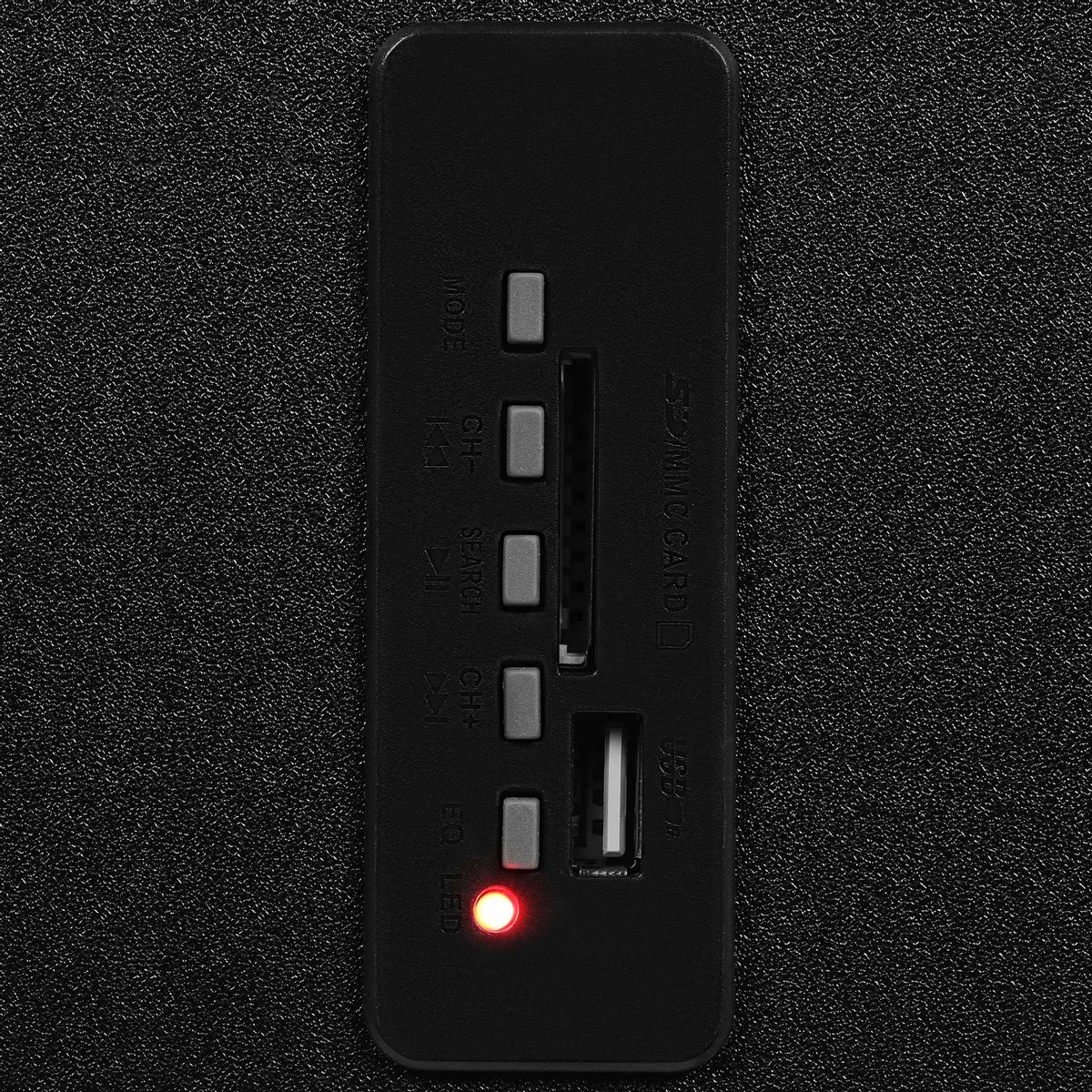 Встроенная панель управления. Механические кнопки на встроенной в верхнюю часть корпуса сабвуфера панели позволяют переключать режимы, управлять эквалайзером и воспроизведением с внешних носителей, осуществлять настройку радиостанций.