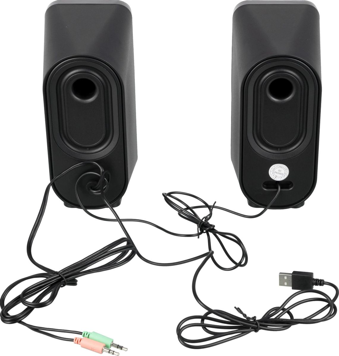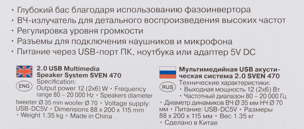 Корпус оригинальных колонок SVEN 470 изготовлен из пластика черного цвета, что положительно влияет на гармоничное сочетание с монитором, системным блоком, ноутбуком, музыкальным центром. Высокое качество звука достигается благодаря частотному диапазону от 80 Гц до 20 кГц, что считается отличным показателем среди аналогичных моделей акустических систем. Колонки подключаются к основному устройству через специальный провод. Для электропитания предназначен отдельный USB шнур.