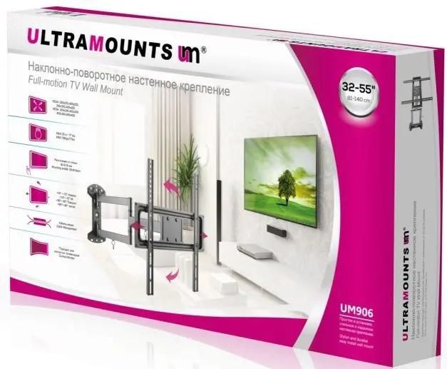 Представленный здесь кронштейн для телевизора ULTRAMOUNTS UM 906 позволит регулировать расположение телевизора согласно нуждам пользователя. Он предлагает настенный вариант установки, а также позволяет осуществлять наклонную и поворотно-выдвижную регулировки. Минимальное расстояние от стены начинается уже с 6.3 см, а максимальное достигает целых 61 см. Благодаря каналу для скрытой прокладки кабеля интерьер не испортят провода от подключаемой электроники.