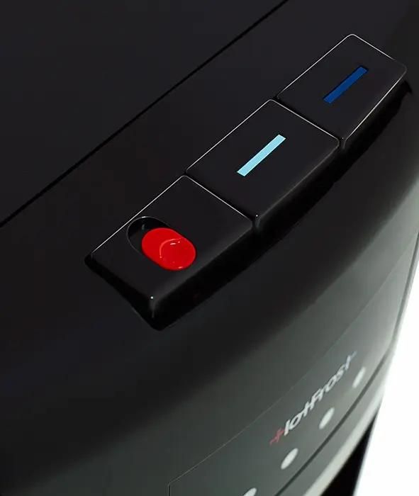 Удобный в использовании кулер HotFrost 35AN оборудован встроенной подсветкой крана для удобного разлива воды в любое время суток. Бутыль устанавливается внизу устройства. Это дает возможность скрыть механизм подачи жидкости от окружающих, а также предотвращает попадание прямых солнечных лучей на воду. Один кран может использоваться для подачи горячей и холодной воды, а также жидкости комнатной температуры.