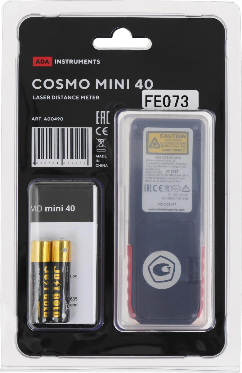 Лазерная рулетка ADA COSMO Mini 40 новая компактная модель лазерного дальномера для измерений до 40 метров. Оптимальный дальномер специальной серии COSMO с минимальным набором функций для измерений и расчетов. Точность и дальность. Лазерная рулетка ADA COSMO Mini 40 предназначена для измерений дистанций до 40 метров внутри помещений и на улице. Погрешность измерения ±2,0 мм. Простое управление. Все измерения производятся при помощи всего 4 кнопок. Первая — измерение, она же включение и переход в непрерывный режим, вторая кнопка для выбора функций: измерение площади, объема, измерения «по Пифагору». Третья - функция сложения и вычитания. Четвертая - отмена и выключение. Оптимальный набор функций. ADA COSMO Mini 40 выполняет самые необходимые функции: измерения расстояний, непрерывные измерения, расчет площади, объема, сложение и вычитание измерений. Недоступные величины (измерение высоких объектов или через препятствие) можно измерить «по Пифагору». Яркий дисплей. 3-строчный черный дисплей с постоянной подсветкой удобен при работе в любое время суток. Белые цифры очень хорошо видно при любом освещении. В нижней строке крупными цифрами отображается полученный результат. В двух верхних строчках цифрами меньшего размера выводится предыдущие значения. Выбор единиц измерения (ft/m) и точки отсчета. На выключенном приборе нажмите и удерживайте более 7 секунд клавишу включения. Выбранные единицы измерения (ft/m) отобразятся на дисплее. При необходимости можно изменить точку отсчета: передняя или задняя плоскость дальномера. Автоматическое выключение. Для экономии заряда батарей через 60 сек автоматически выключается подсветка экрана (при бездействии). По прошествии 180 сек дальномер выключится полностью. Компактный и точный. Благодаря своей эргономичной и компактной конструкции с резиновыми протекторными накладками, ADA COSMO Mini 40 надежно сидит в руке. Прибор легкий всего 120 грамм, умещается в любой карман. Повышенная защита от ударов при падении. Защита от брызг воды и пыли IP54. Лазерная рулетка ADA COSMO Mini 40 отличный выбор для работ внутри помещений и на улице. Оптимальный дальномер для стройплощадки и дома.