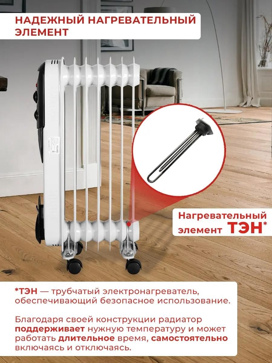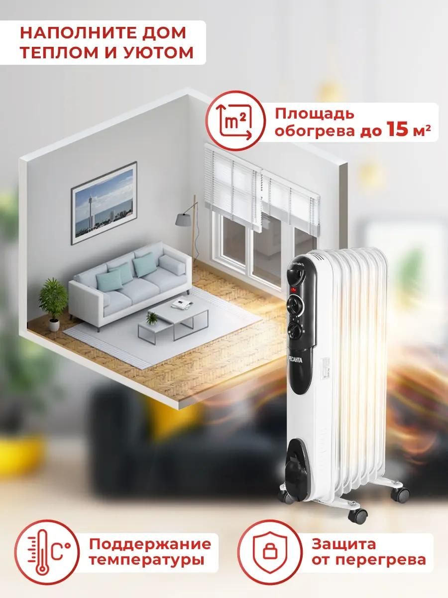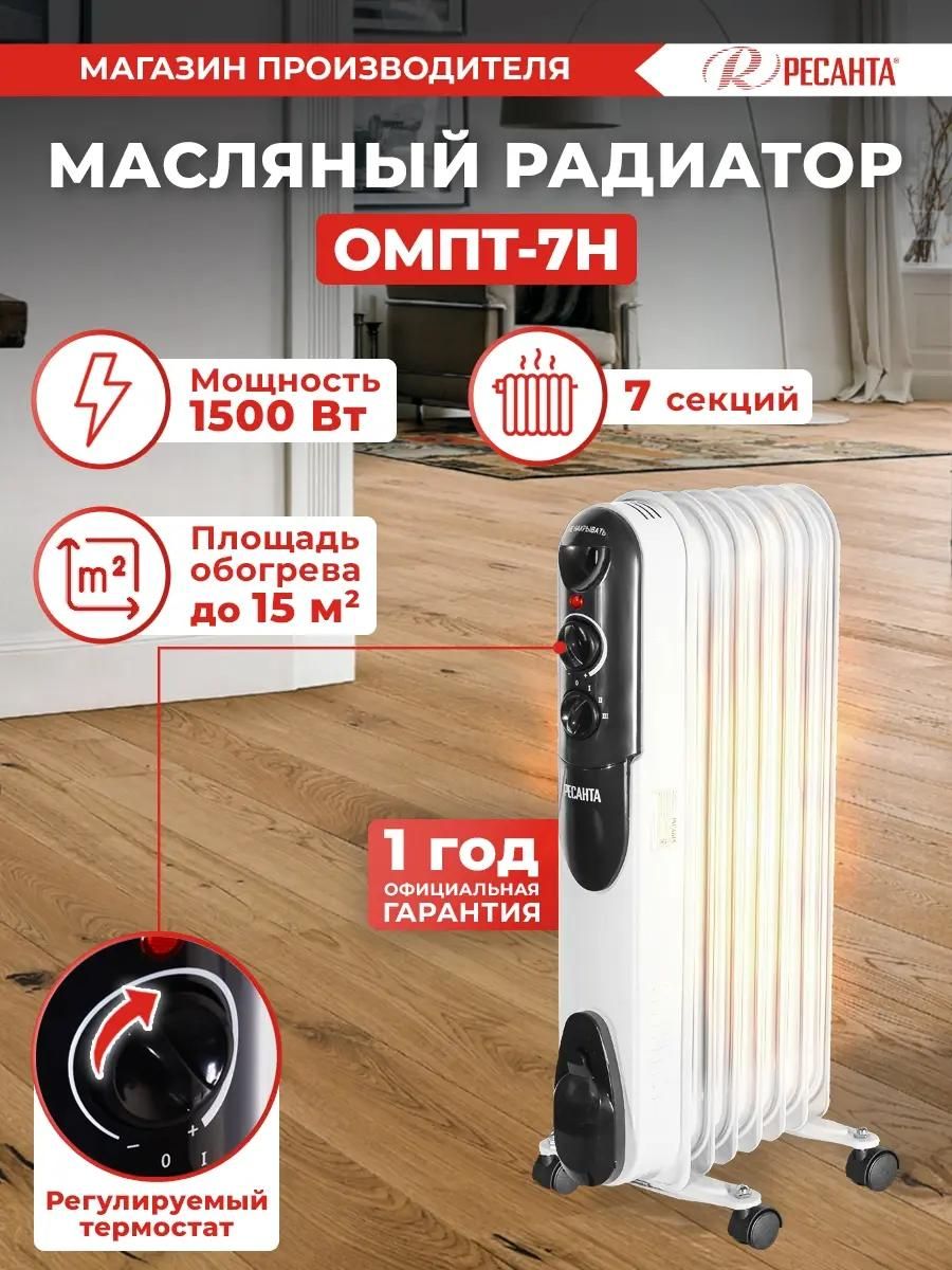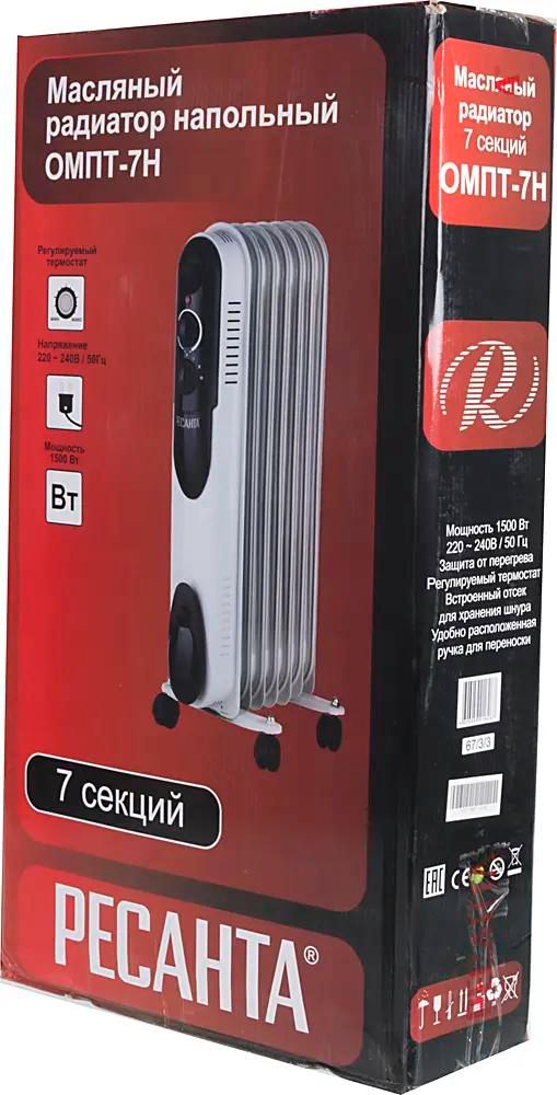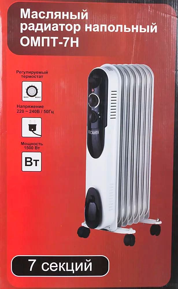 Масляный радиатор РЕСАНТА ОМПТ- 7Н имеет 7 секций и без труда обогреет помещение площадью до 15 кв. м. Имеет стильный дизайн - белый цвет с черной панелью для регуляторов. Предельная мощность радиатора составляет 1500 Вт. Имеет 3 режима мощности, которые регулируются. Способ управления радиатора - механический. Встроенный термостат регулирует температуру. Защитный режим автоматически отключит обогреватель при перегреве.