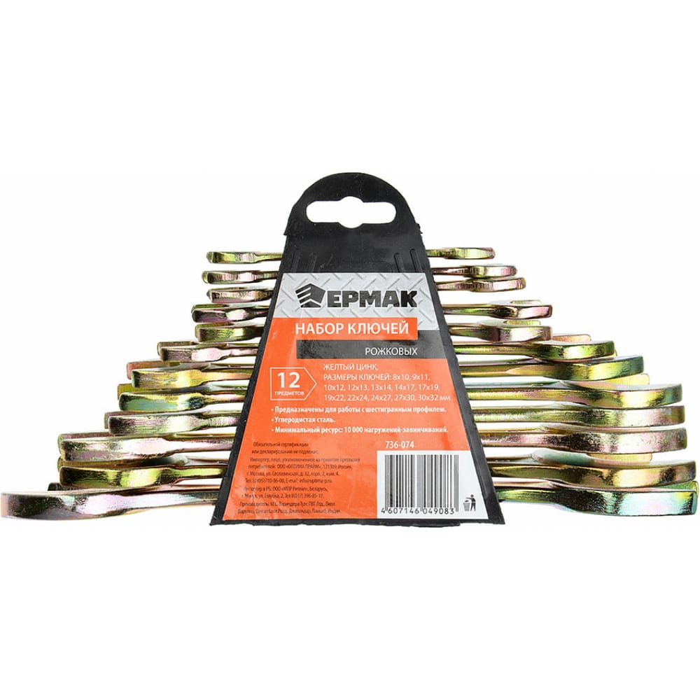 абор рожковых ключей ЕРМАК 12 предметов, 8x10-30x32мм, желтый цинк, пластик холдер 736-074