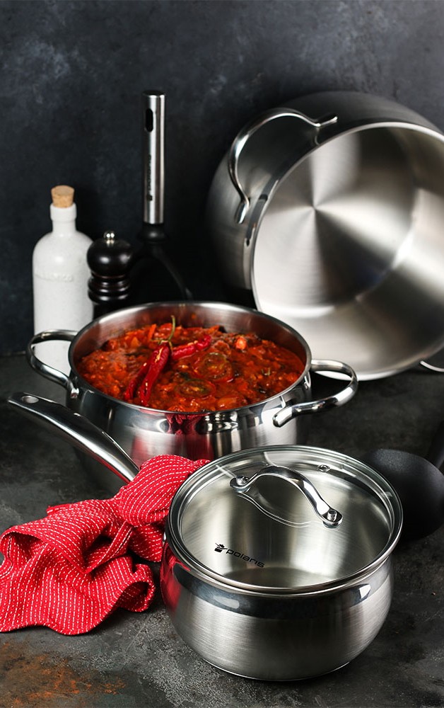 Тройное вштампованное дно с прослойкой из алюминия. Плавный переход от дна к стенкам повышает надежность крепления дна, обеспечивает быстроту нагрева.