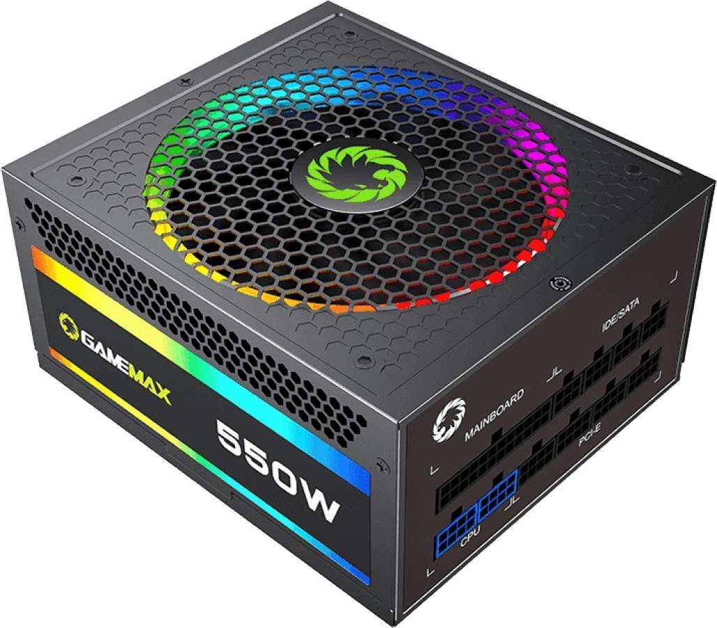 GameMax RGB550 — полностью модульный блок питания с сертификатом энергоэффективности 80 PLUS Gold. По основной цельной линии +12 В выдает 528 Вт, то есть почти сто процентов от суммарной заявленной мощности. Коннектор питания процессора усиленный 4+4-пин, а видеокарточных коннекторов предусмотрено две штуки 6+2-пин.