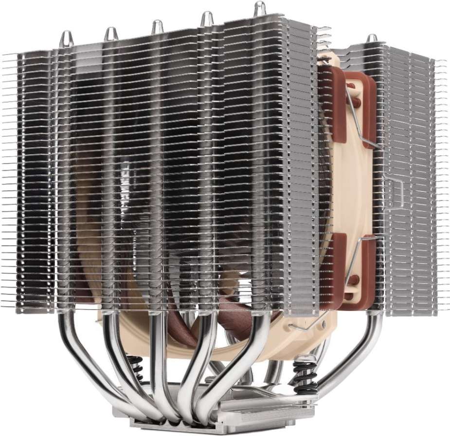 Noctua NH-D12L — самый компактный среди двухбашенных кулеров для процессоров, всего 14.5 сантиметров. Типичная же высота охладителя составляет 15.5 - 16.5 см. Причем ширина двух башен отличается: правая раза в полтора тоньше, чтобы уж наверняка не перекрывать модули оперативной памяти. Левая наоборот толще, чтобы рассеивать больше тепла.