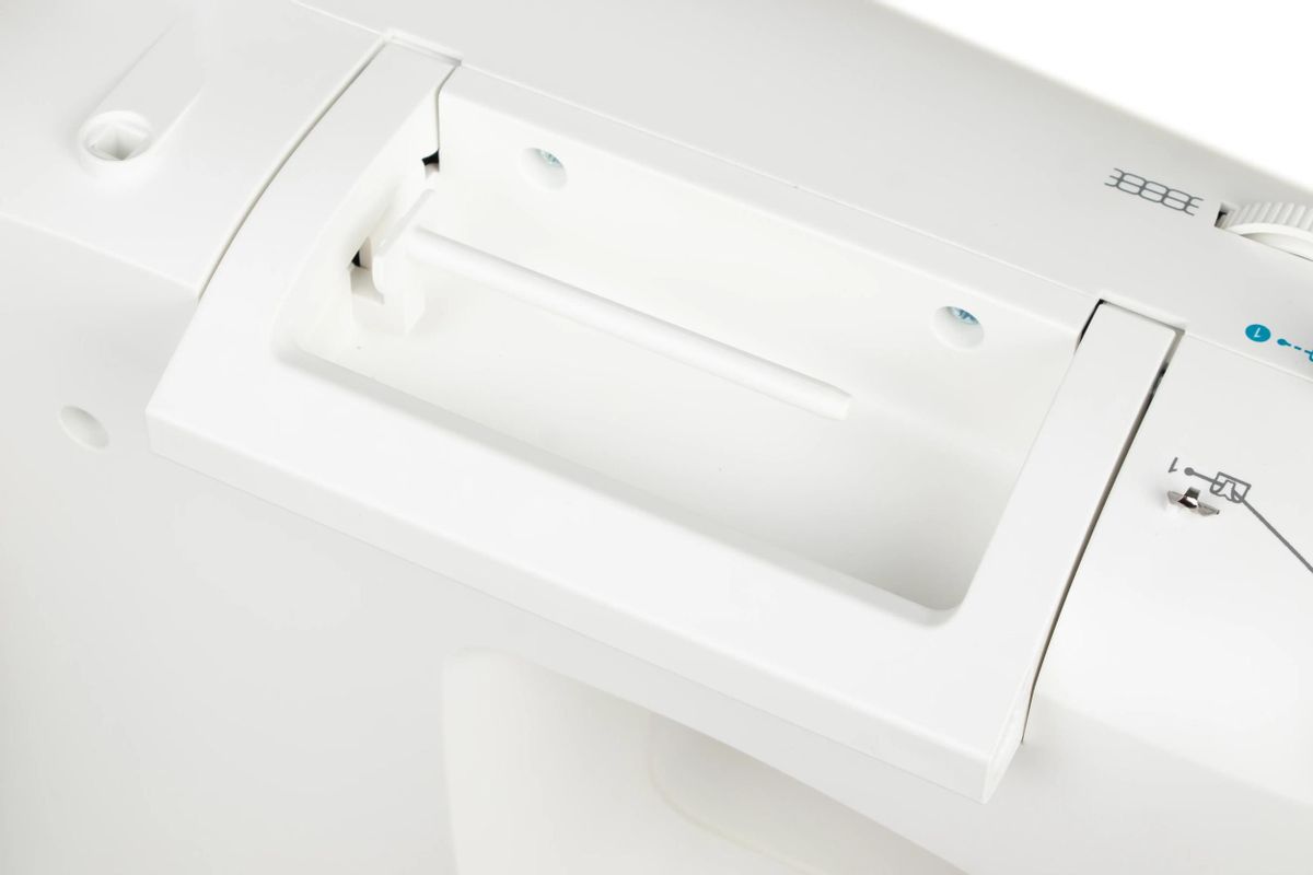 Машина оснащена большим дисплеем, отображающим все параметры работы. Удобство использования дополнительно обеспечивают подсветка и отсек для швейных принадлежностей.
