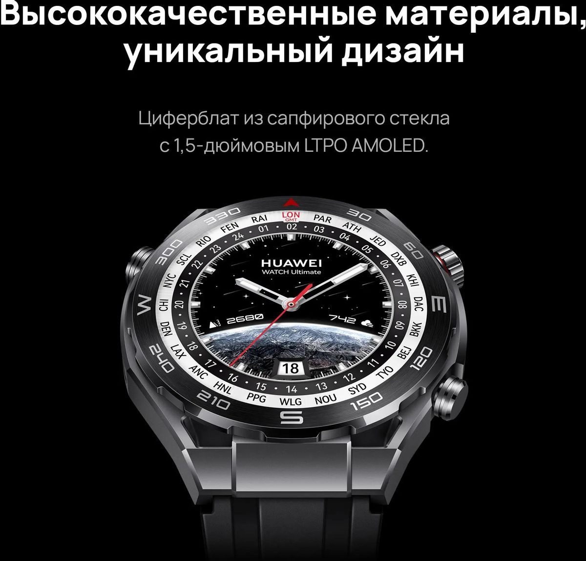 Часы Huawei Watch Ultimate CLB-B19 получили круглый сенсорный экран диагональю 1.5 дюйма 466х466 точек. AMOLED-матрица передает изображение с максимально возможной глубиной черного цвета, что обеспечивает высокую четкость и контрастность картинки.