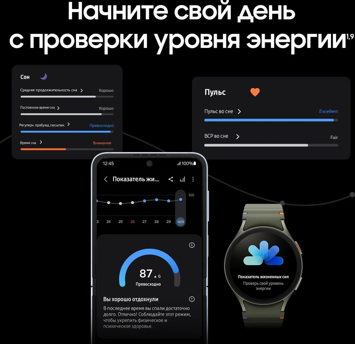 Смарт-часы Samsung Galaxy Watch 7 LTE имеют комплект датчиков — акселерометр, барометр, гироскоп, а также сенсоры для считывания параметров состояния здоровья. Это позволит контролировать физическую активность и достичь желаемых результатов.