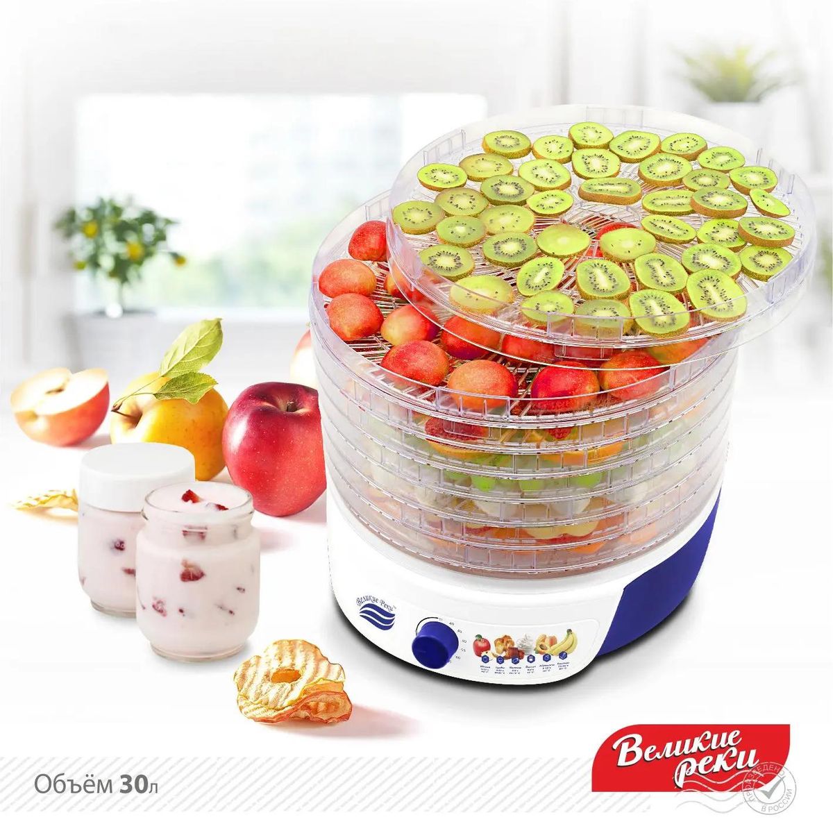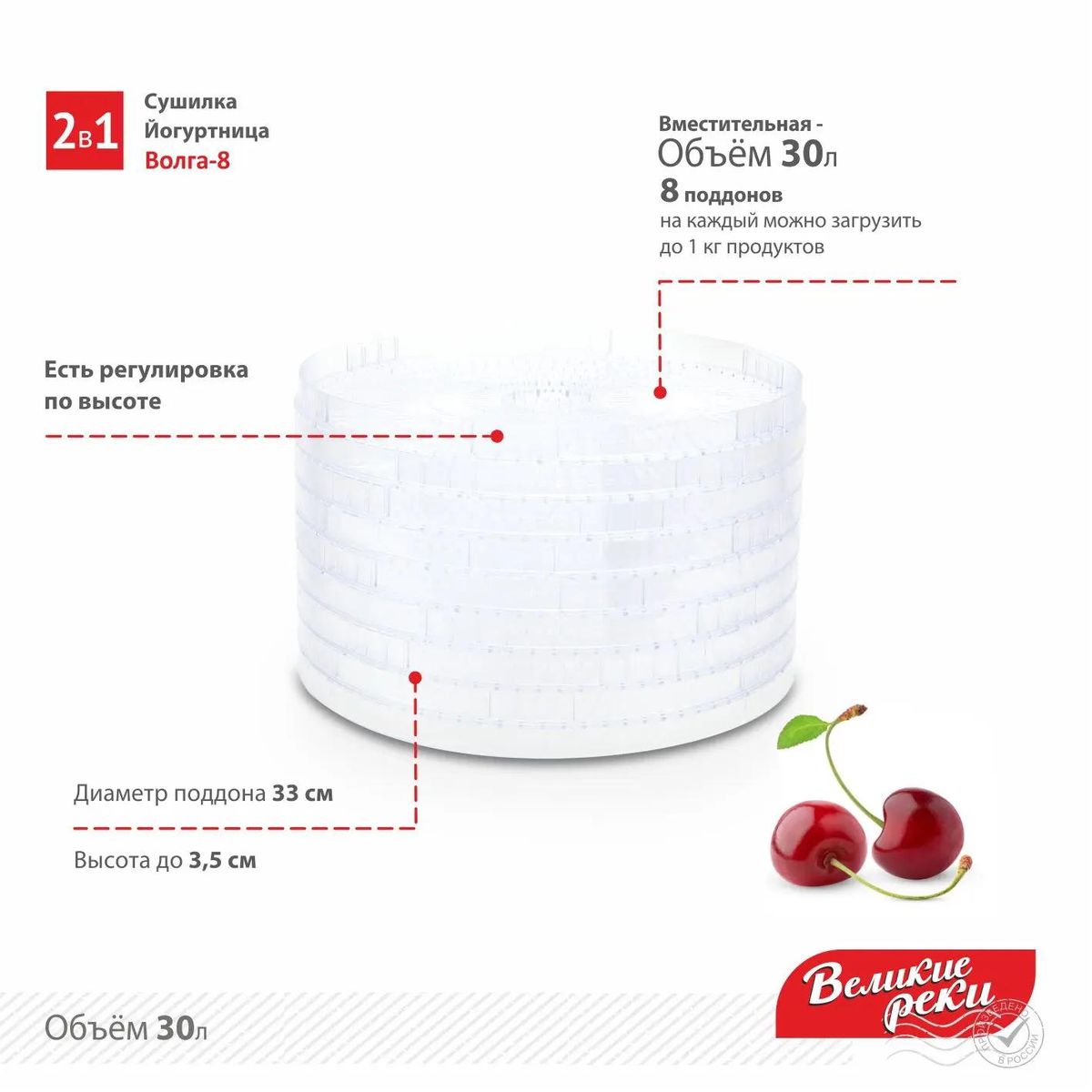 Благодаря встроенному вентилятору с максимальной рециркуляцией воздуха гарантируется равномерное высушивание продуктов. Сушилка для овощей и фруктов ВЕЛИКИЕ РЕКИ Волга-8 подходит также для изготовления домашнего натурального йогурта.