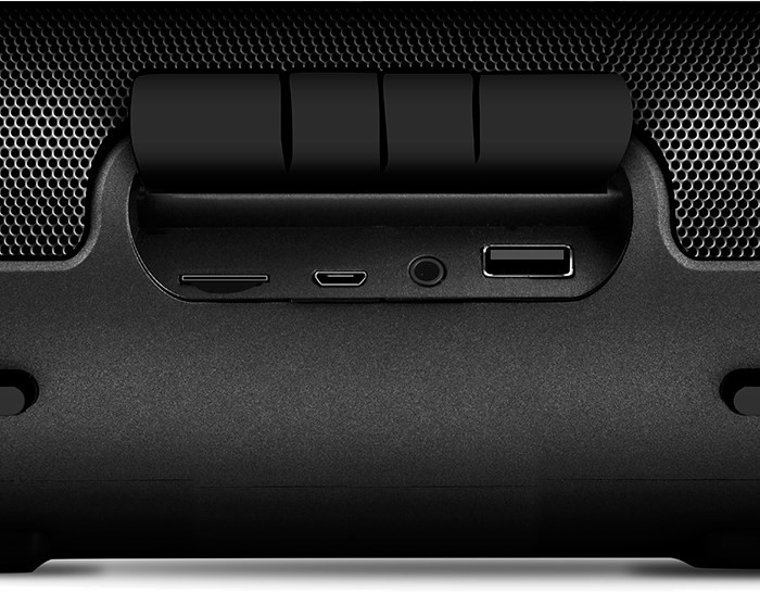 Ручка. Прорезиненные вставки и ножки. Стереозвук. FM приемник. Картридер. Воспроизведение с флэшки. До 20 часов работы.