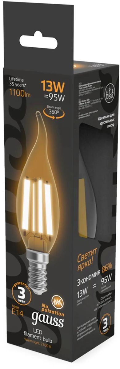 Упаковка ламп филаментная GAUSS E14, свеча на ветру, 13Вт, 10 шт. [104801113]